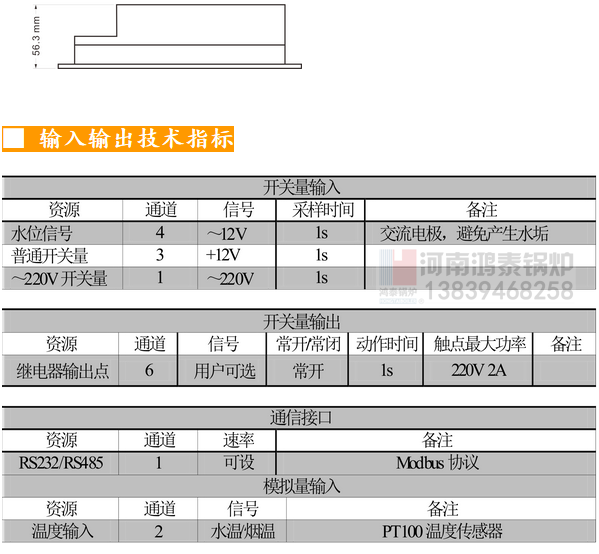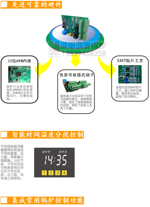 集成锅炉常用控制功能;人机界面采用4.3寸彩色液晶显示屏,显示清晰,操作简单;智能多路故障同时检测与中文信息显示,让操作者更清楚当前锅炉状态;集成标准MODBUS协议,方便与其它设备连接,可实现远程控制!CPU采用工业级ARM32位处理器,可快速完成复杂的自控算法,输出响应更快!智能时间温度分段控制,比普通控制器更节能!多路高低压开关量输入、输出和模拟量输入、输出,使扩展应用更灵活。 参数存储采用铁电存储器,掉电保存十年,保证参数不会因干扰而改变!可按用户需求快速定制功能!